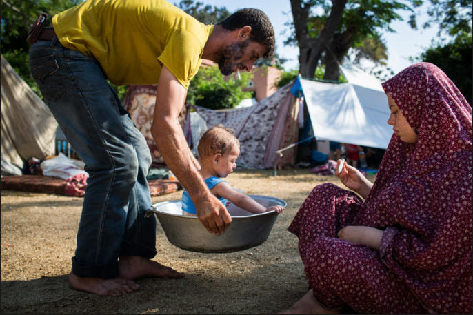 Shadi Awad Elejalaa, 30, pictured with his wife Samah, 22, and his 9 month old son Yazan, outside their makeshift