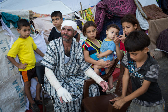their makeshift shelter in the grounds of Shifa Hospital, in Gaza city. Mohammed is from the Shejaiya district of Gaza