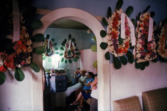 Cuba 1991 - A family sits by the casket of their deceased relative at a velorio, a Cuban style wake for the