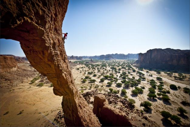 James Pearson making the first ascent of the Arch of Bashikele, Ennedi Desert, Chad, Africa.