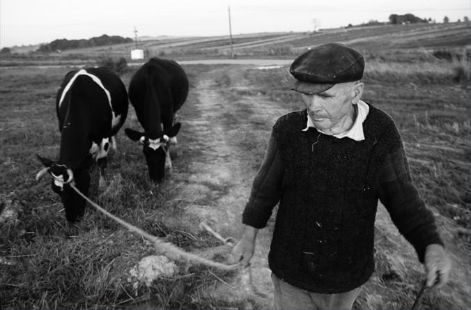 One of the farmers from Brzeziny village leading a cow from the grass-land before sunset.