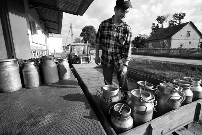 Worker from the milk bottling works in Lelow delivers fresh milk from Jurassic villages farmers.