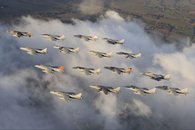 Harrier Force commander Air Cdre Gary Waterfall, the RAF and Royal Navy flew 16 Harrier in formation to mark the