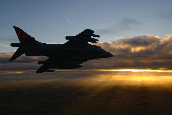 The sunset image depicts a Harrier returning to its base at RAF Cottesmore as the type gave its final bow.