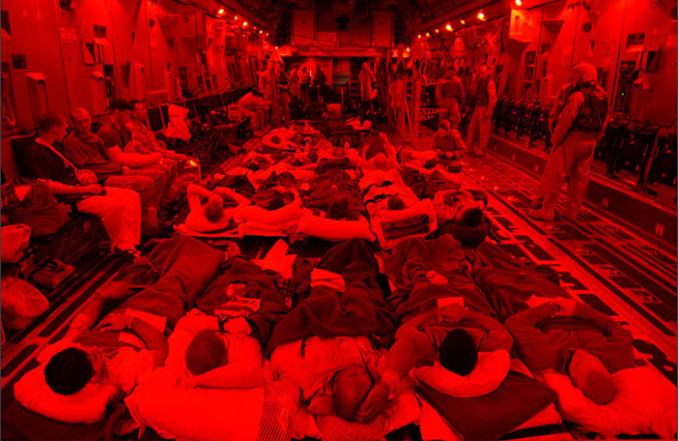Germany from the Balad Air Force base. The interior lights of the plane are red because of an "alarm red" attack,