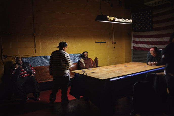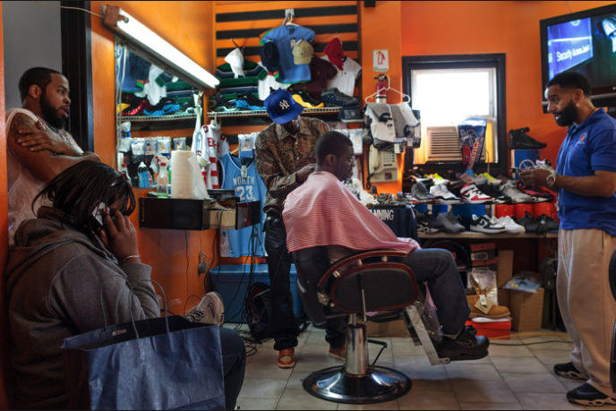 A customer gets his hair cut at Exclusive Barbershop, Brownsville, Brooklyn, 2012.
