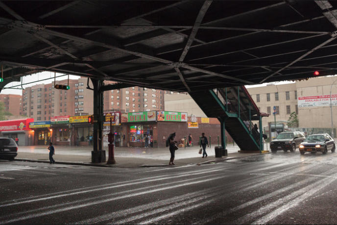 First rain on a hot day in May, under the 3 train, Brownsville, Brooklyn, 2012.