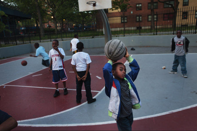 A young boy plays basketball with a group of friends at the basketball courts between the Tilden Housing projects,