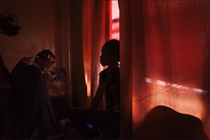 Julie Robertson plays with a friend at her great grandmother's house in the Howard Houses, Brownsville, Brooklyn,