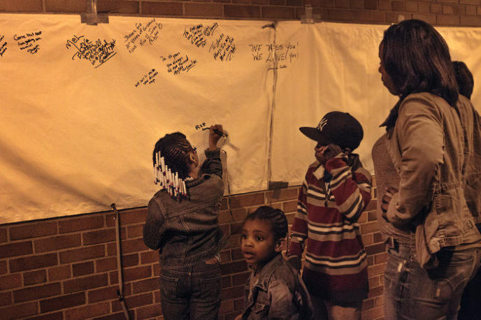 A young girl writes RIP on a banner placed outside of the Brownsville Recreation Center on the night of the death of