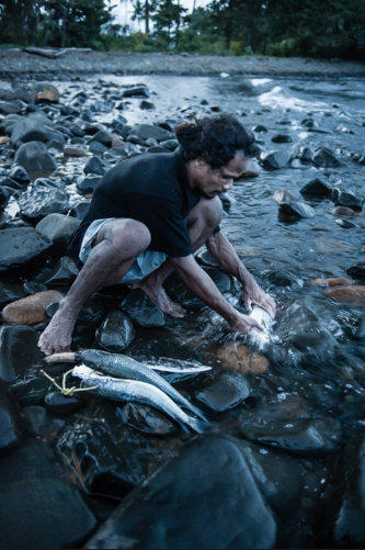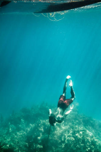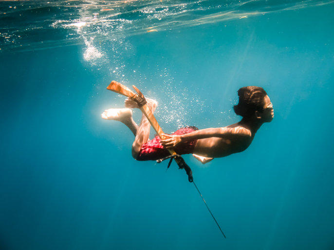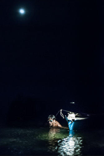 The majority of fishermen use nets or handmade spear-guns and wear wooden goggles. Some work as night as, in