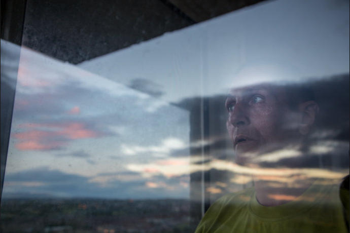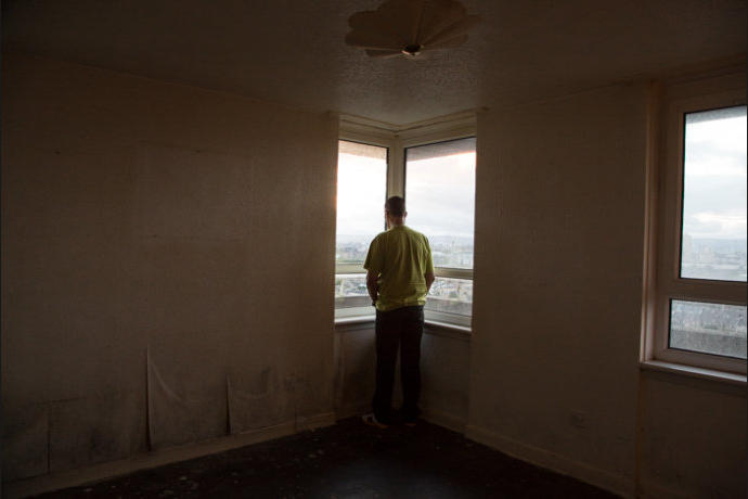 One of the last tenants of the Whitevale Flats in Gallowgate admires his last view of the sunset. August 2013.