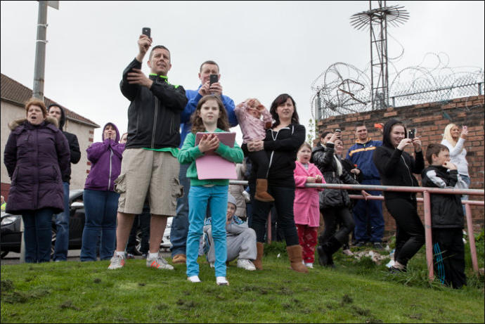 Residents in the north of Glasgow venture out to witness the demolition of Birnie Court, one of the flats at Red Road.