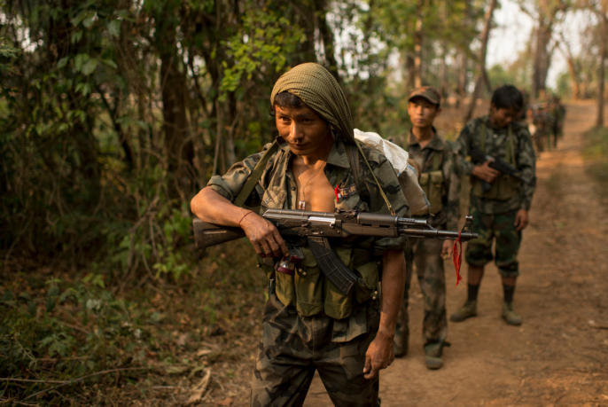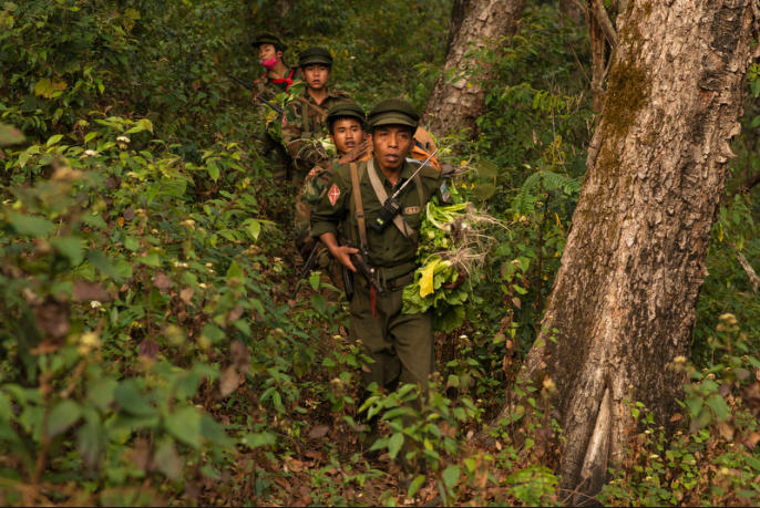 Soldiers from the TNLA (Ta'ang National Liberation Army) walking out from the forest near their battalion base after