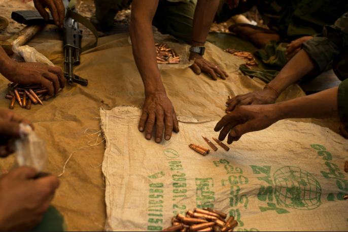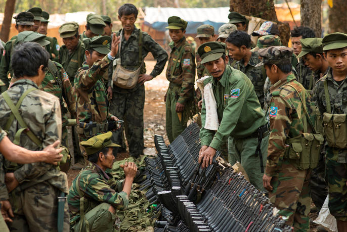 TNLA (Ta'ang National Liberation Army) commander preparing the distribution of new AK47 assault rifle at the 101