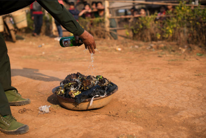 An officer prepares a fire to burn 1.5 kilograms of opium that the army seized from traffickers near Loi Chyaram village.