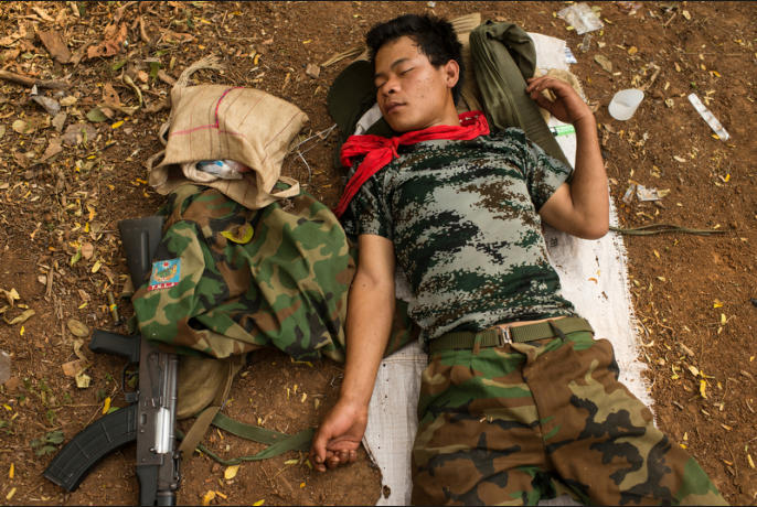A TNLA soldier from the 101st Battalion rests in the army-controlled Region 1 in northern Shan state. The battalion is