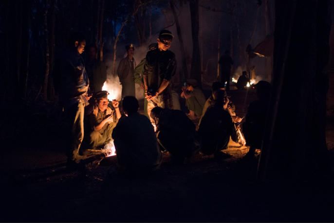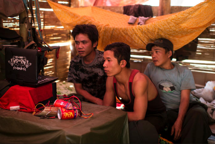 TNLA (Ta'ang National Liberation Army) soldiers relax while watching a movie at 101 battalion base camp. TNLA