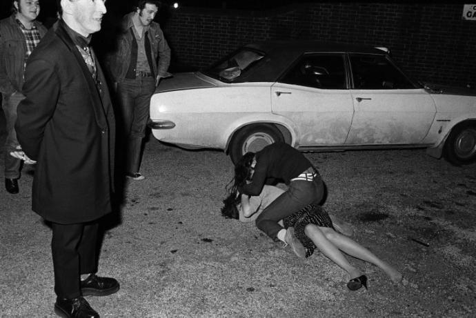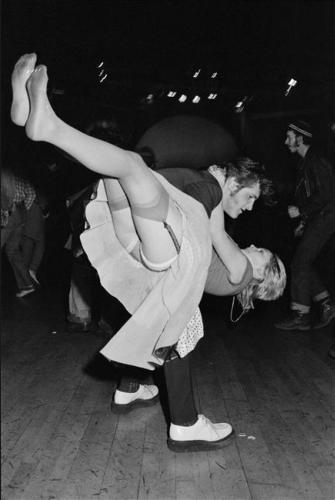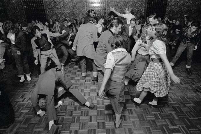 throng of jiving, singing teenagers, bottles and fireworks were thrown; four shop