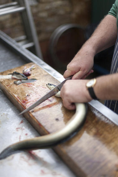 Joe Cooke killing and gutting eels in the yard of Cookes' Eel, Pie