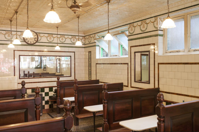 The interior (including the painted tin tiles on the ceiling) of Manze's Eel, Pie and Mash shop in Walthamstow, East