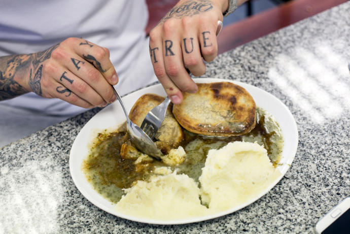 A customer at Cannon's Pie and Mash Shop, Camden,