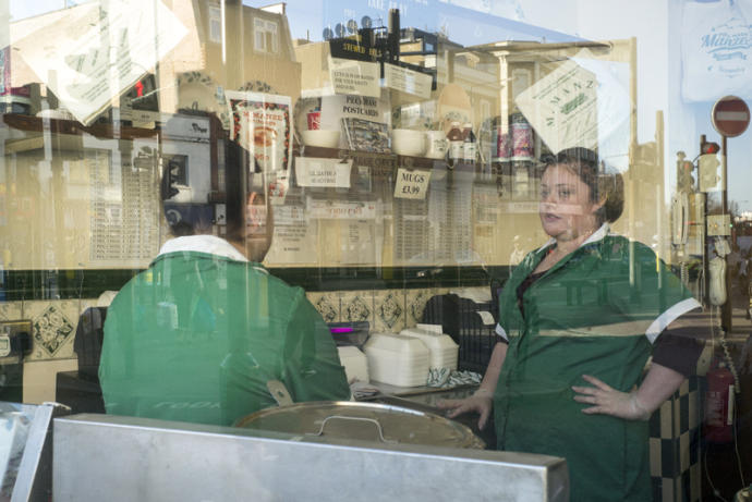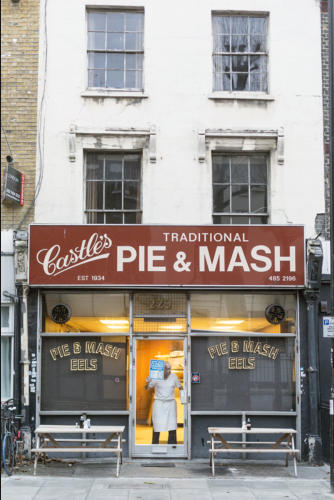 mirrors the sense of dislocation and fragmentation of traditional communities that the shops serve. Today’s eel, pie and
