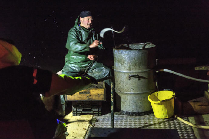 Dick and David McIlroy fish for eels from their boat on Lough Neagh, Northern Ireland. The brothers, part of the Lough