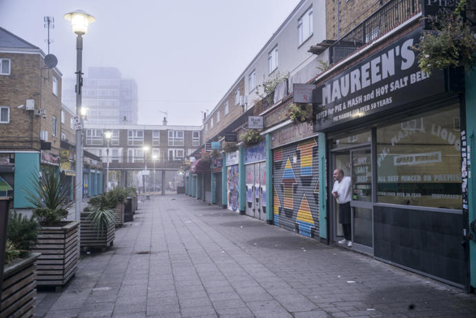 In the early morning mist of dawn, Jason Patterson opens the shutters at Maureen's Pie and Mash shop, Poplar, East