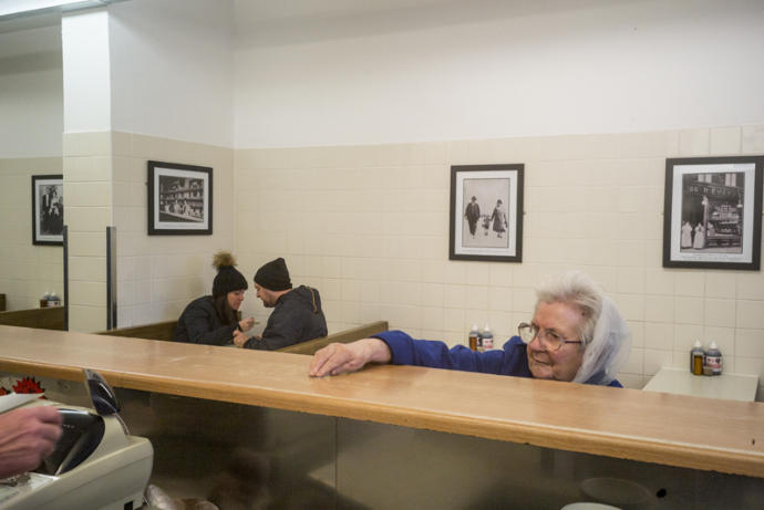 A customer pays for her meal at Arments Pie and Mash shop, London.
