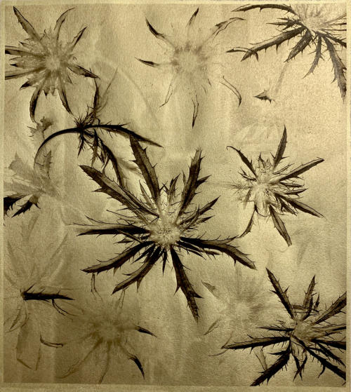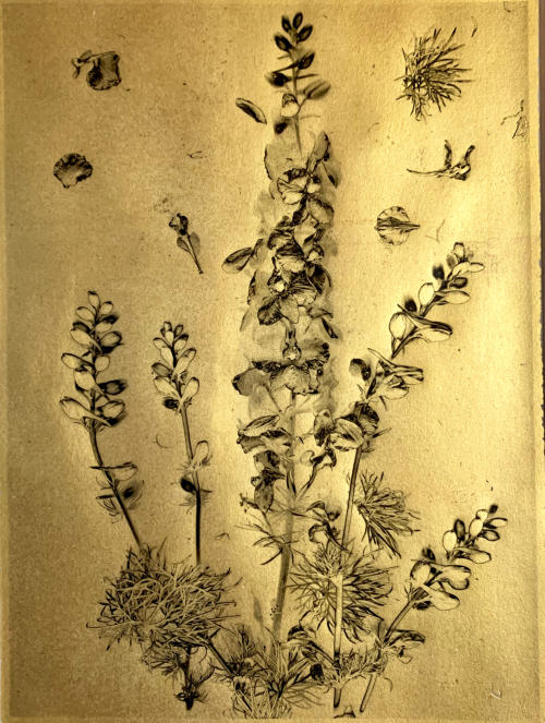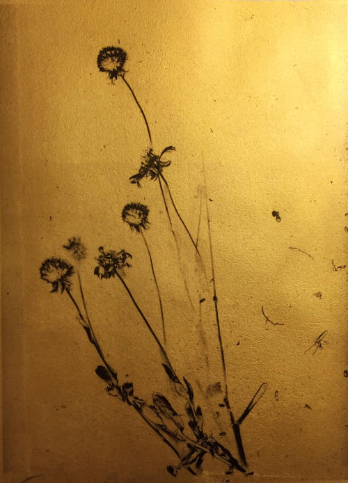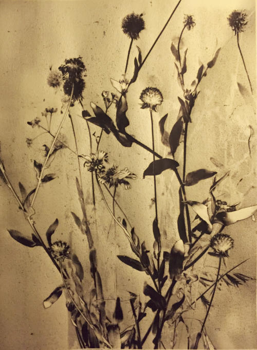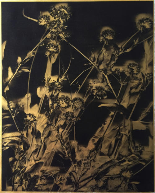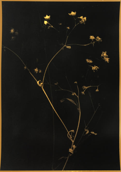You Are Eternity, You Are the Mirror is an exploration of beauty as an antidote to personal and political crisis. In times of heartache, disaster, and impasse, many turn to beauty found in the natural world for solace and refuge. Pairing these images with the writings of Kahlil Gibran underscores the significance and multiplicity of the notion of beauty in our lives. These images are made from plants and flowers, which are photographed, printed on vellum, and hand-applied with 24k gold leaf, varnish, and wax. The project is inspired by Anna Atkins’s botanical studies as well as surrealist photographers like Florence Henri and Maurice Tabard, who manipulated imagery and materials to create multi-faceted, imagined spaces that deepened the viewer’s experience.