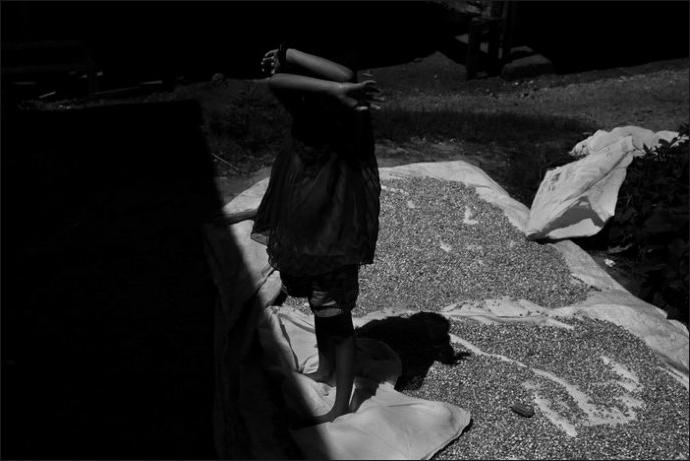 Shamrhidhi (5 years old from from Lamsure village, Makawanpur district) outside her house on the corn kernels and