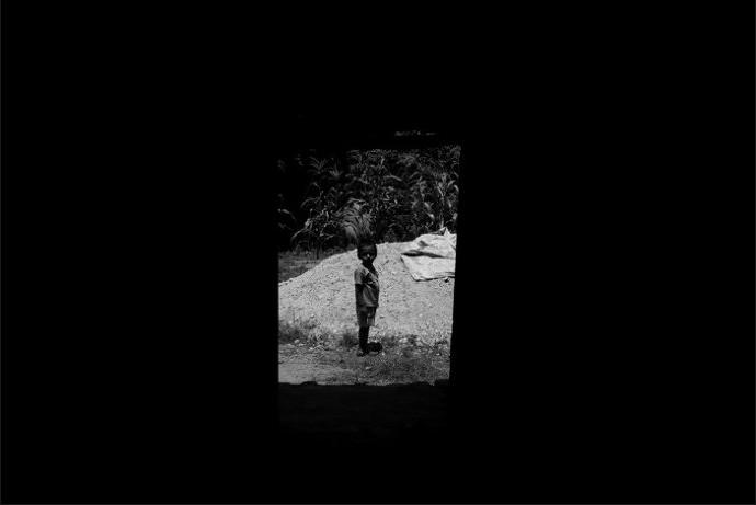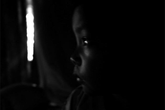 Remit (3 years old from Padampokhari village, Makawanpur district) hiding in the shadows near the fence that