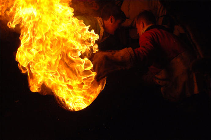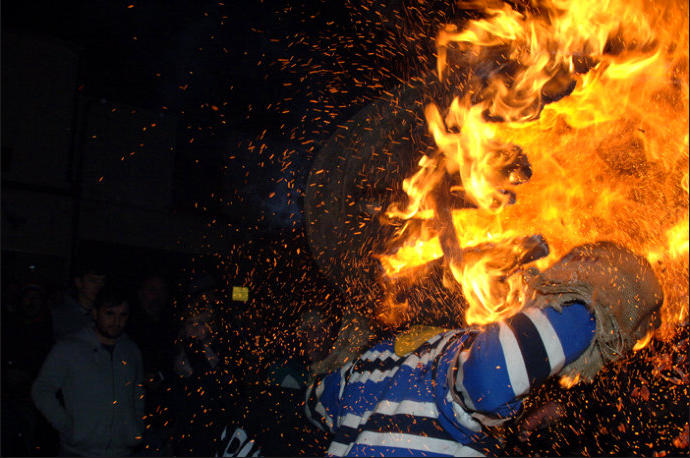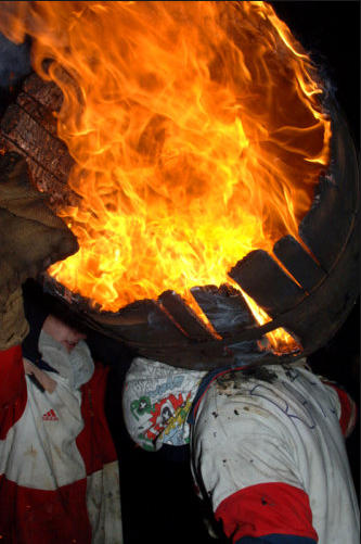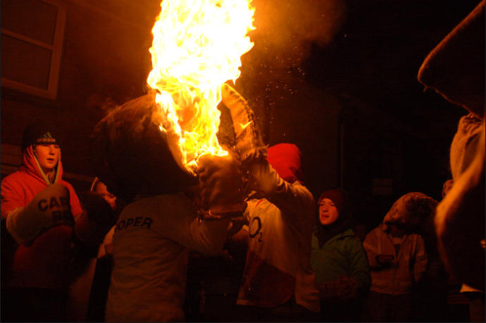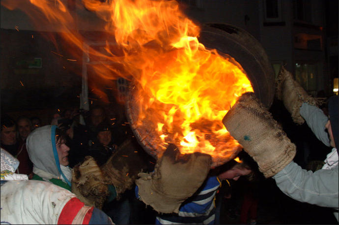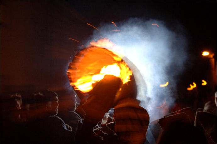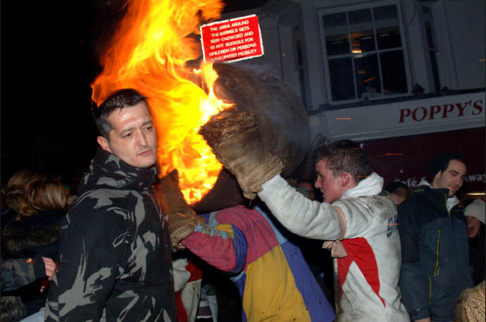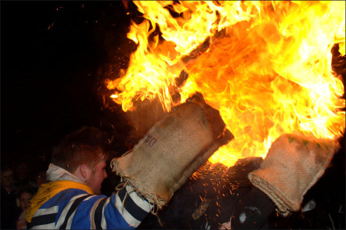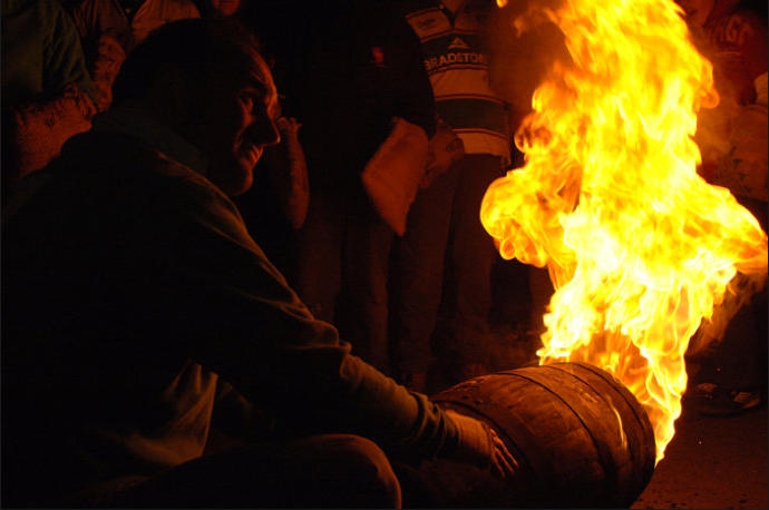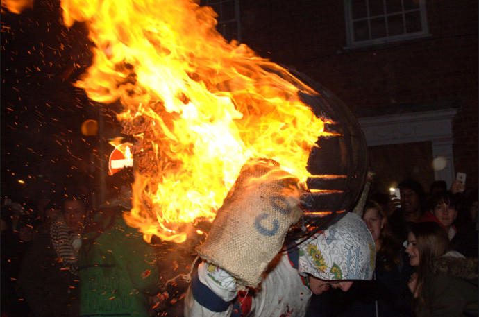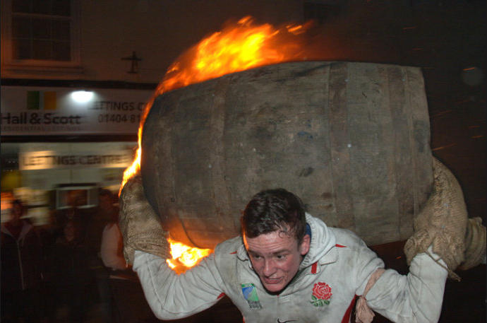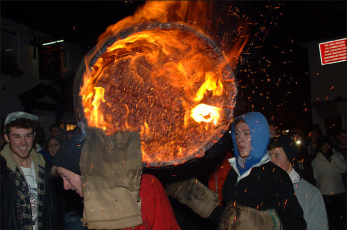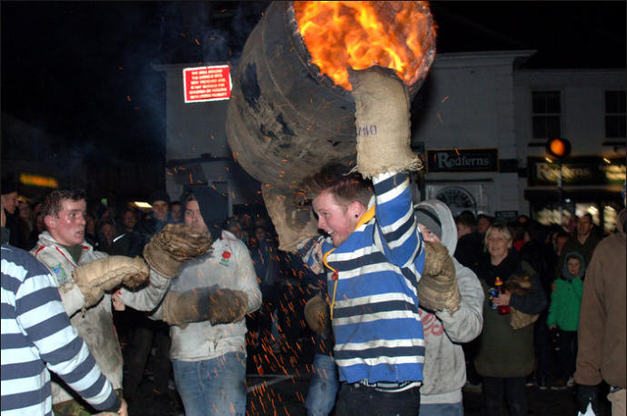 Each year on Guy Fawkes night, the small Devon town of Ottery St Mary hosts a traditional event that is hundreds of years old.Thousands of spectators gather to watch the spectacle of full sized, flaming tar barrels being hauled through the streets of this otherwise sleepy community.Seventeen barrels of various sizes are carried throughout the day starting with small ones for the children and medium sized for the youths and women. The largest are reserved for the men and are paraded later in the evening. No-one is quite sure where the tradition came from. Some believe that it was a form of fumigation for the cottages while others say that it was started as a warning of the approach of the Spanish Armada. Whatever the origins, the heaving of burning tar barrels is a dangerous business that the town’s people take very seriously. Observers of the event witness an unforgettable, wild night of roaring flames, sweat and adrenaline-fuelled fervour.