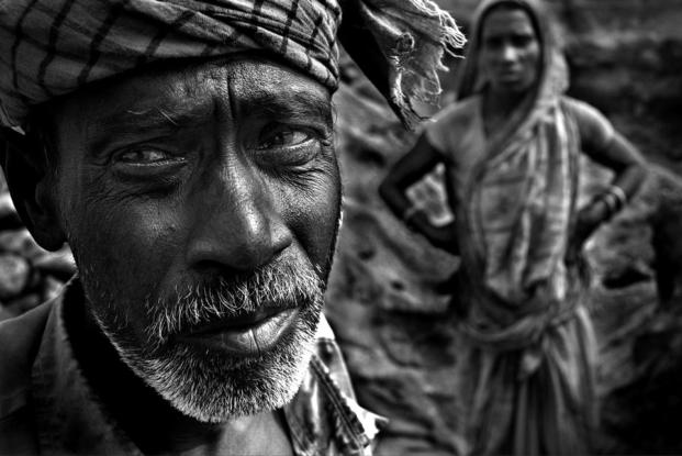 involved in stone crushing. He covers his face using his Gamchha (local weaved cloth), in an attempt to