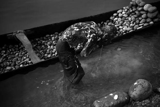 Stone collector Abu Bakkar bathing at the bank of the Piyain River after nearly twelve hours of work.