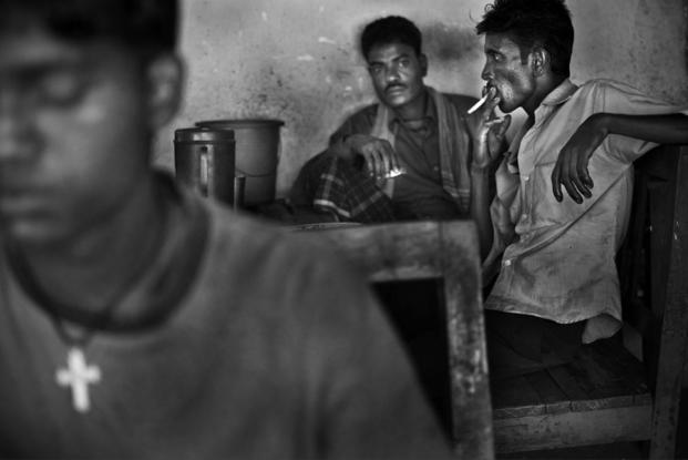 labourers are seen sipping tea, smoking bidi (tobacco), and chatting.