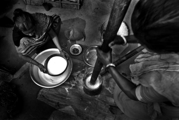 Women belonging to the minority Hindu community grind rice to make cakes for 'Paus Shankranti' festival