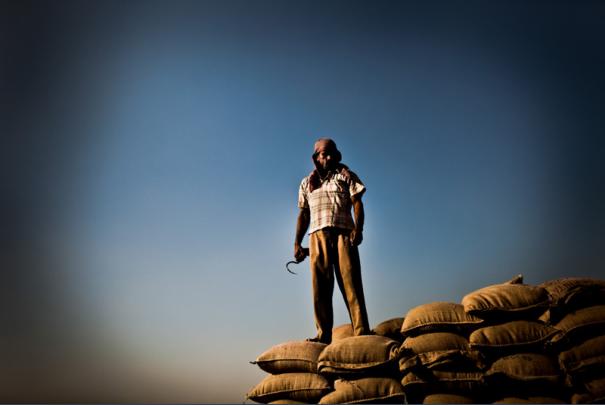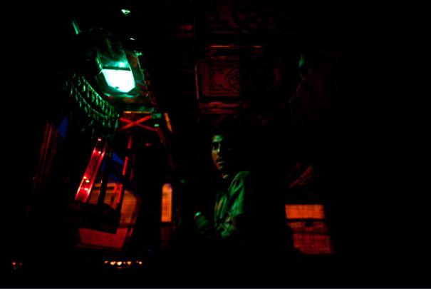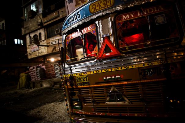 A driver waits in his cab while his truck is loaded with vegetables at the Vegetable Mandi in North Delhi.