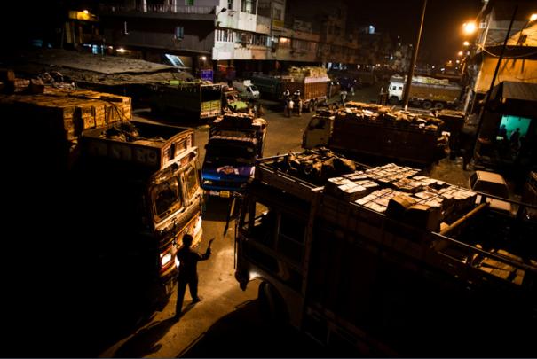 Trucks trying to move through the Subzi Mandi in North Delhi.