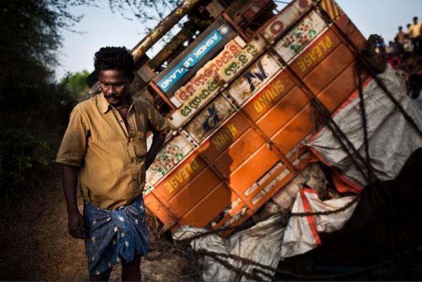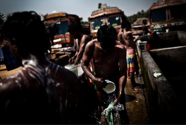 Truck drivers on the border of Andra Pradesh and Orissa, in Icchapuram.