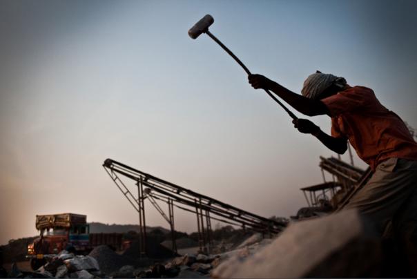 A man breaks rocks at a factory in southern Orissa, which will later be ground and hauled away to make