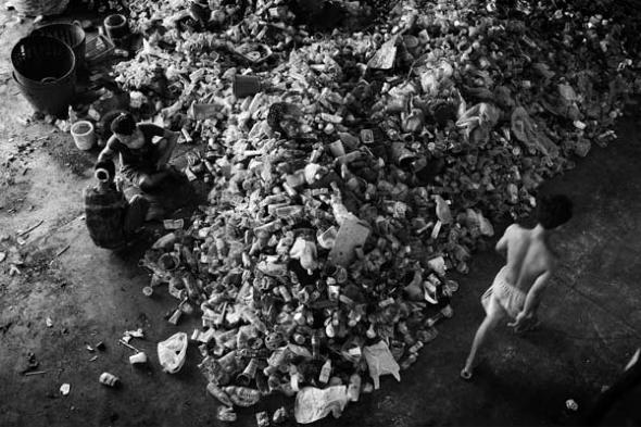 Thai dealers pay 1 thai bath (0,02 euros) per kg for the recycled plastic to the migrant workers living