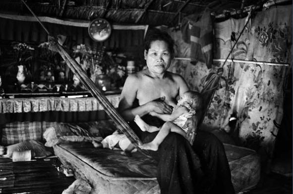A mother feeds her child. In the rubbish dump, every family has a minimum of three