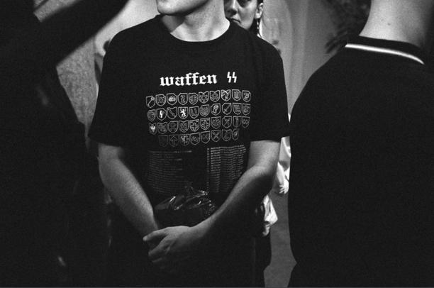 Right-wing radical with Mussolini watch and image and another with t-shirt with letters Skinhead and the