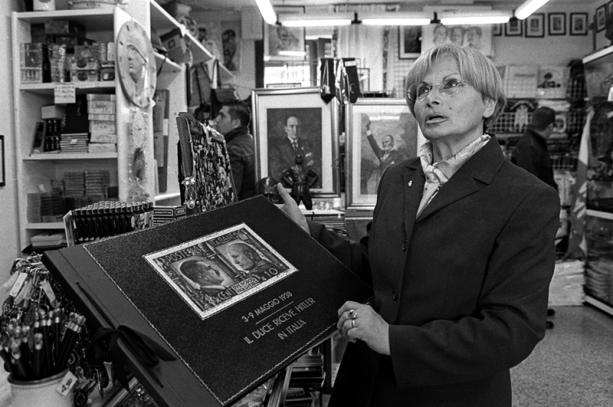 On Predappio's main street, souvenir shops enjoy a burgeoning trade in Mussolini paraphernalia: calendars,