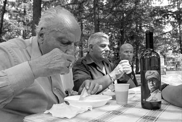 Picnic of Italian right-wing radicals next to a wine bottle with a photo of Benito Mussolini in the garden of