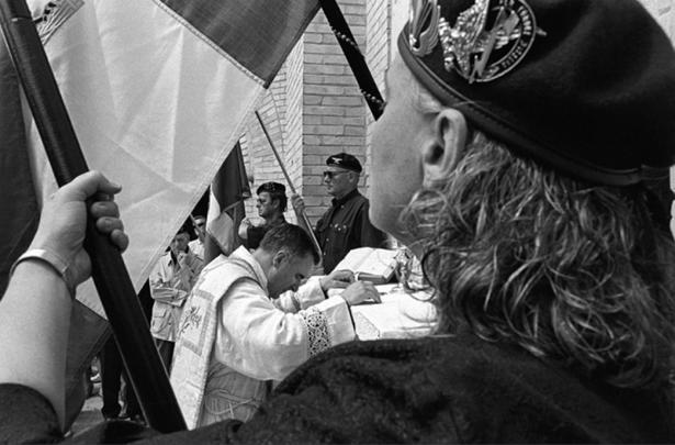 Patre Giulio Tam and fascist with flags at a church service in memory of Mussolini in front of the crypt of