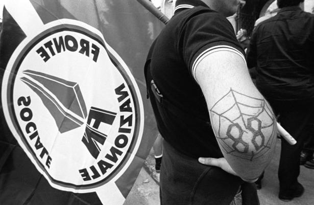 Right-wing radical with tattoo of the fascist symbol "88" for "Heil Hitler" (8th letter of the alphabet) and flag