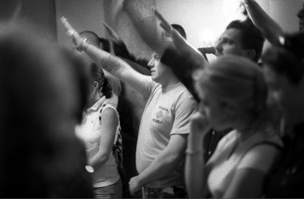 Neo fascists with Nazi salute inside the crypt ot the maosoleum of Mussolini at San Cassiano Cemetery.